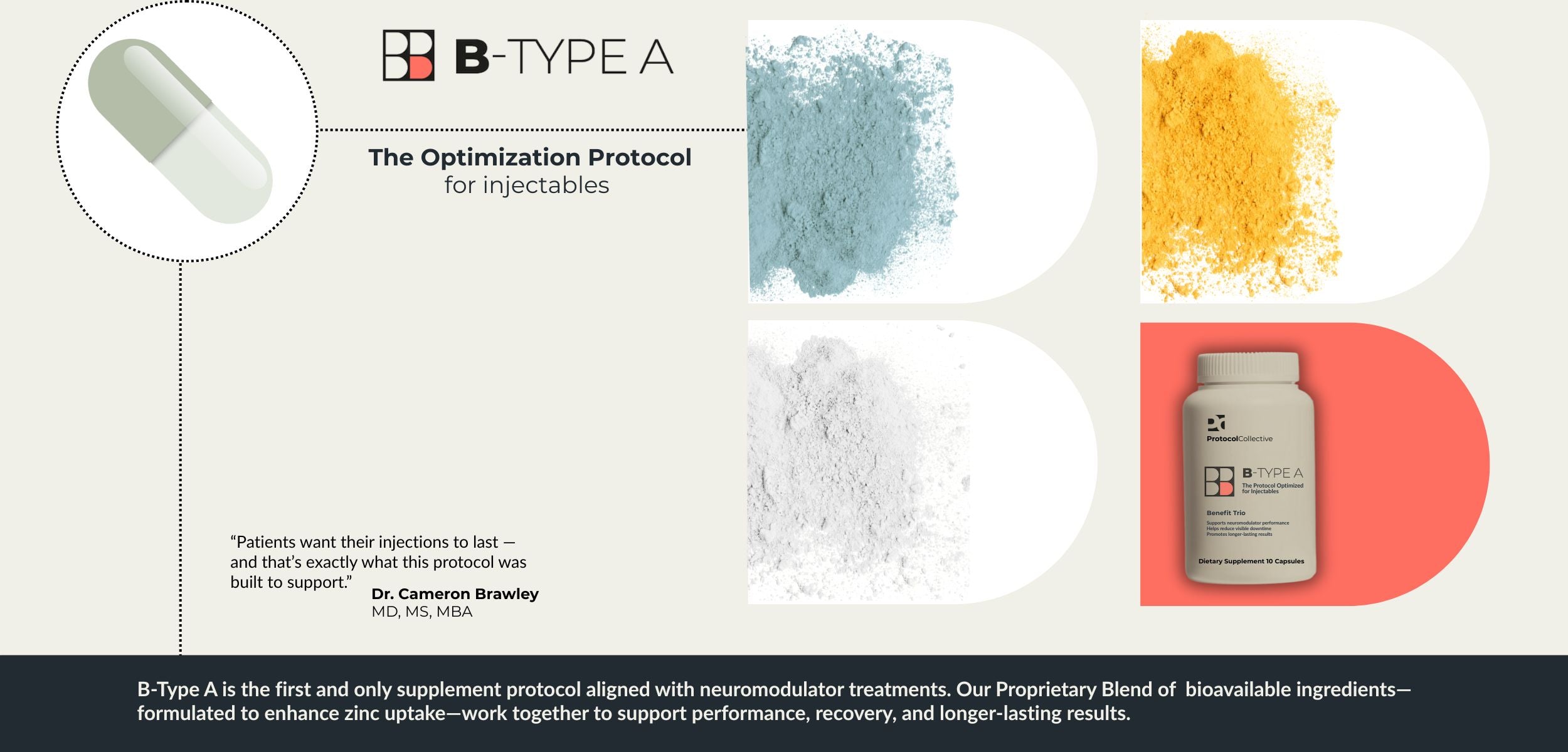 B-TypeA is formulated to support neuromodulator performance, recovery, and visible result longevity. Individual outcomes vary based on factors like procedure type, injector technique, and your unique physiology.