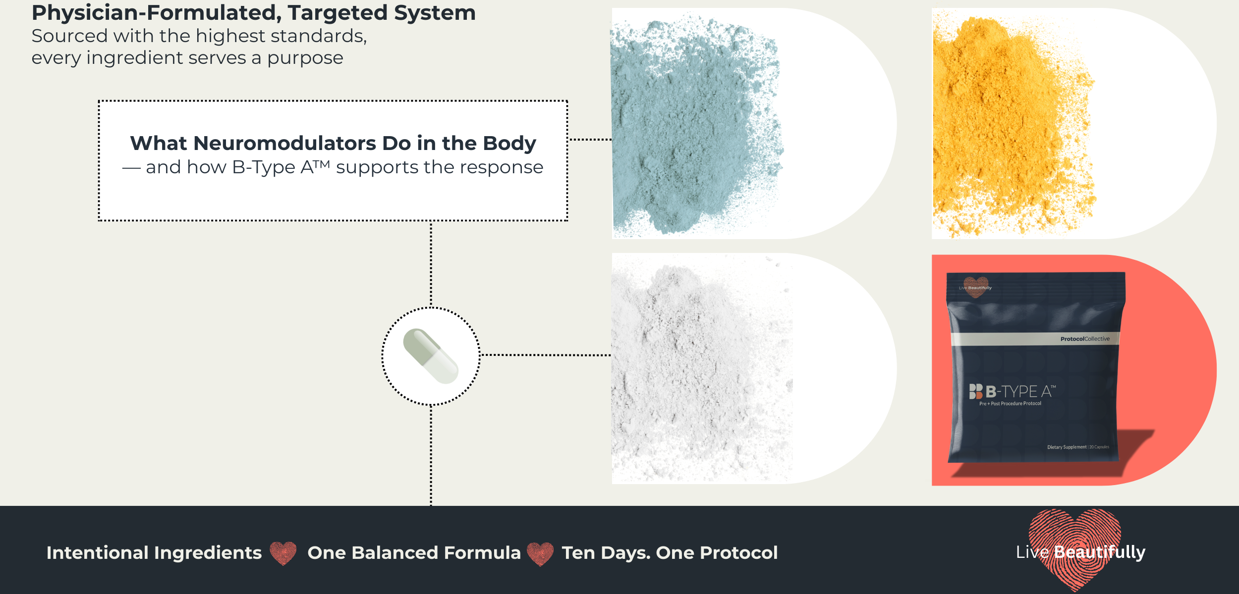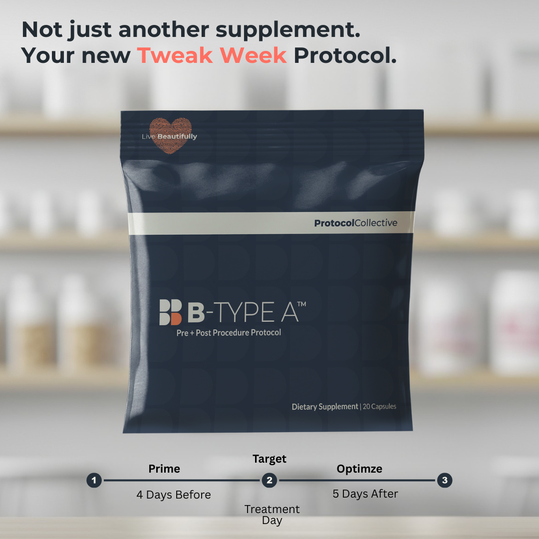 B-TypeA™ is the first-of-its-kind supplement protocol designed specifically for people who get Botulinum Toxin Type A injectables — including Botox®, Xeomin®, and Daxxify®.