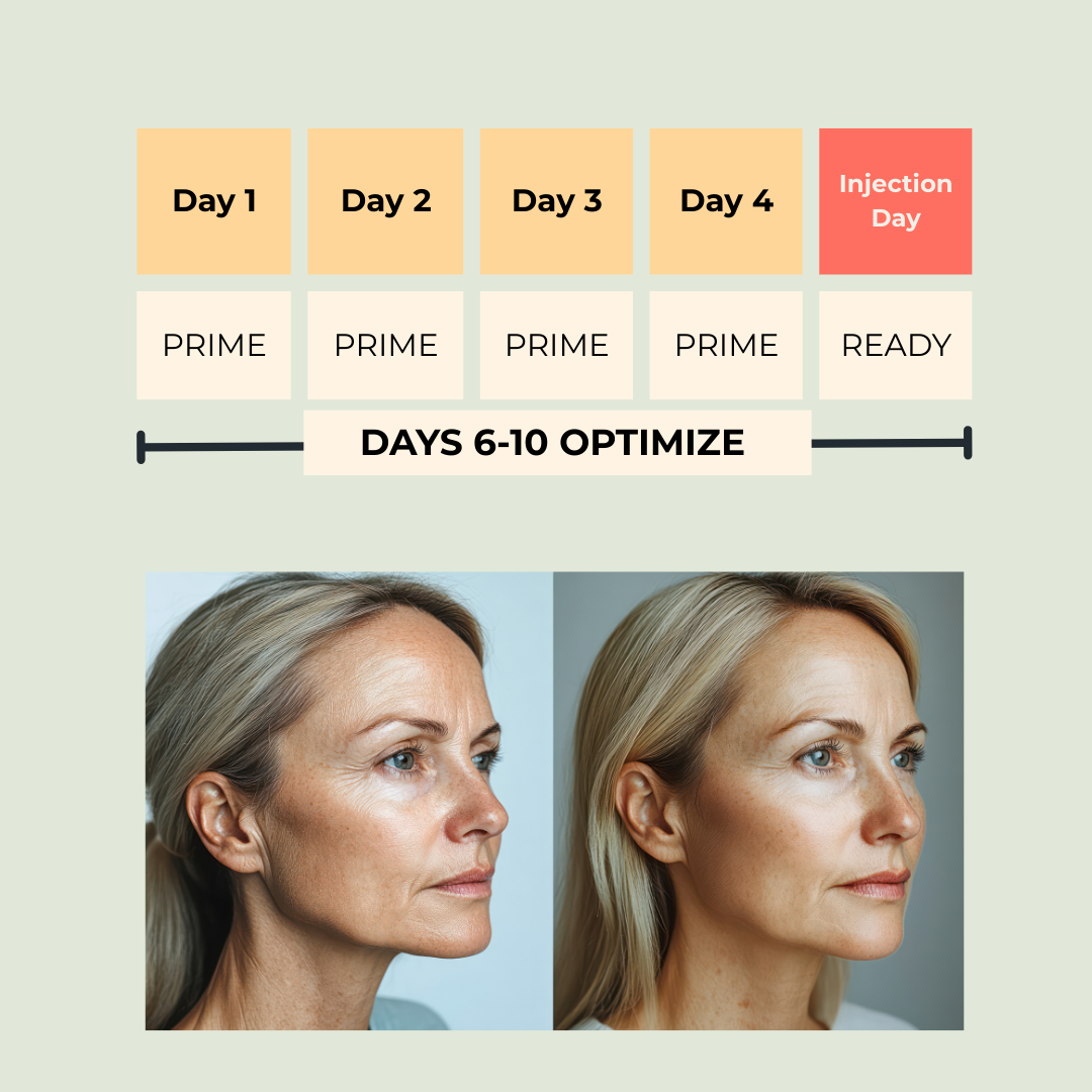Neuromodulators follow a biological timeline. Physician-formulated for maximum results — B-Type A primes the body before treatment and supports the response in the days that follow.